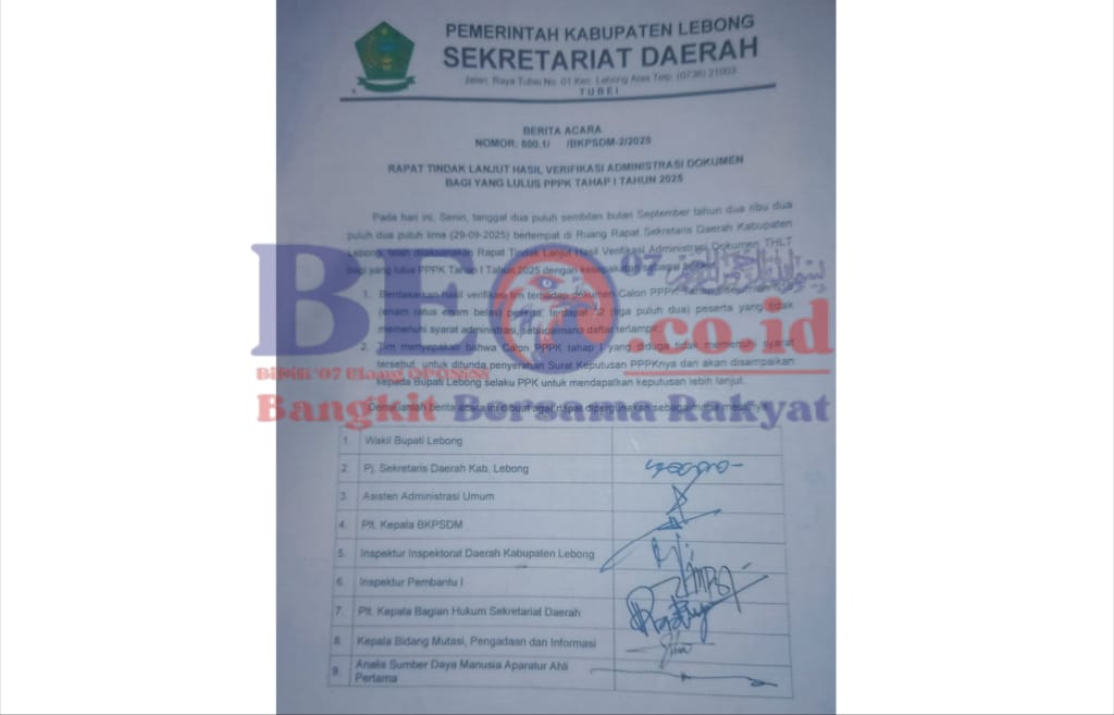 Berdasarkan informasi yang di peroleh beo07.co.id, berdasarkan hasil rapat tindak lanjut verifikasi administrasi yang di laksanakan di ruang rapat Sekda Lebong pada 29 September 2025 di sebutkan bahwa dari 616 peserta PPPK tahap I yang di nyatakan lulus terdapat 32 peserta yang tidak memenuhi persyaratan Administrasi. Kemudian, tim verifikasi menyepakati bahwa PPPK tahap I yang tidak memenuhi syarat untuk di tunda penyerahan surat keputusan ( SK ) PPPK.