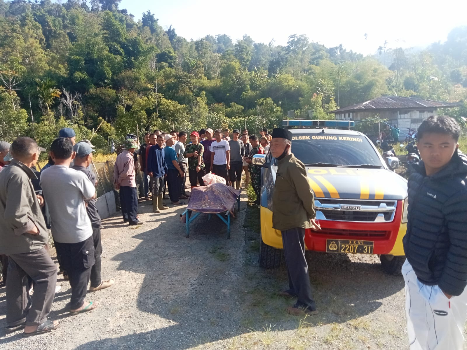 Kapolsek Gunung Kerinci, Iptu Alti Irawan melalui Bhabinkamtibmas, Brigadir Febi Fernanda setelah mendapatkan informasi dari Kepala Desa Sungai Batu Gantih langsung bergegas ke TKP dan melakukan evakuasi jenazah korban untuk di lakukan pemeriksaan secara mendalam.