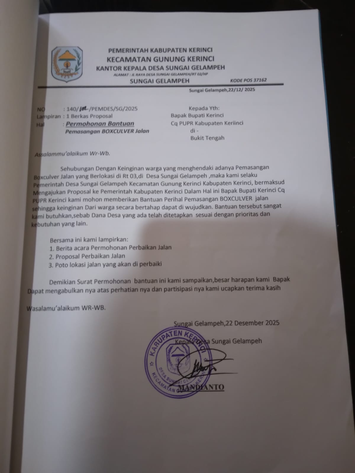 Menurut Kepala Desa Sungai Gelampeh, Madianto menyampaikan bahwa pemerintahan desa telah mengusulkan proposal untuk perbaikan jalan kepada Pemerintah Daerah Kabupaten Kerinci sekitar 2 bulan lalu.