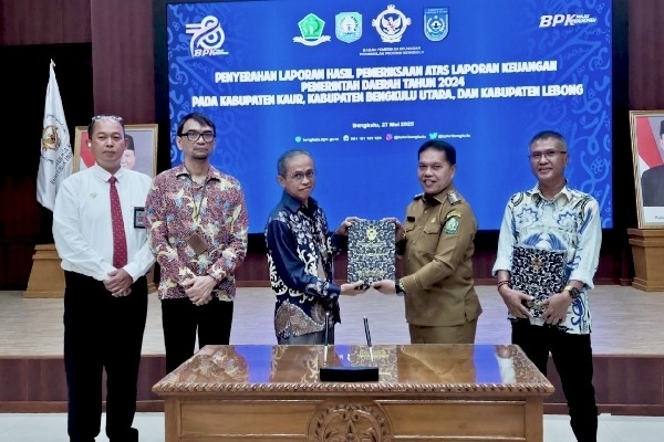 LEBONG, BEO07.CO.ID, – Pemerintah Kabupaten Lebong menerima opini Wajar Dengan Pengecualian (WDP) atas Laporan Keuangan Pemerintah Daerah (LKPD) Tahun Anggaran 2024. Penyerahan laporan dilakukan oleh Kepala BPK Perwakilan Bengkulu kepada Bupati Lebong H Azhari SH MH didampingi Wakil Ketua I DPRD Lebong Ahmad Lutfi SH, Selasa (27/5/2025).