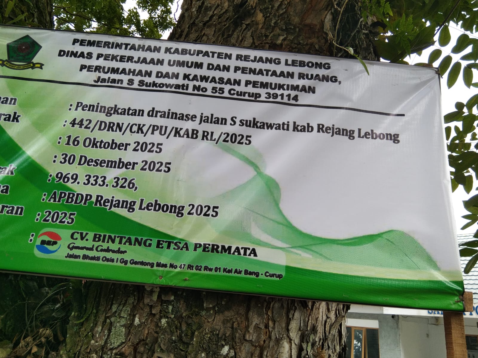 Dari data dihimpun dilapangan, (19 Nop.2025) Peningkatan Drainase jalan Sukowati dimulai 16 Oktober, selesai 30 Oktober 2025, dengan nilai Kontrak Rp. 969.333.326- sumber APBD Rejang Lebong 2025.