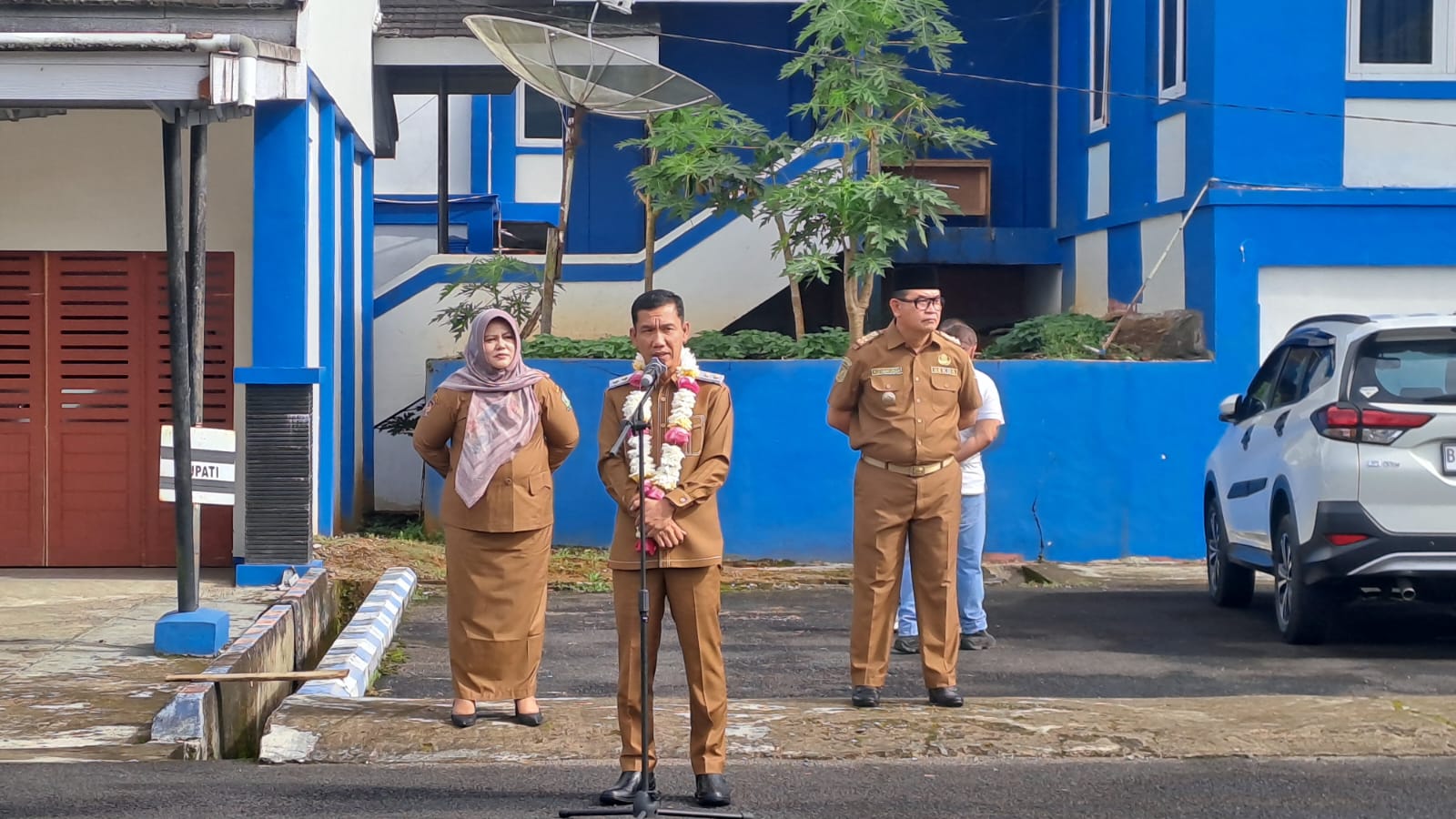 LEBONG, BEO07.CO.ID – Ada pemandangan yang menarik di hari pertama masuk kerja Wakil Bupati Lebong Bambang ASB S.Sos M.Si, Senin (25/02/2025) pagi. Usai melaksanakan acara penyambutan dan apel perdana, Wabup Lebong tidak langsung memasuki ruang kerjanya, tetapi tetap berdiri depan kantor ditemani Istrinya Ny. Martha Linda Putri SP M.Si, beserta sejumlah pejabat Pemkab Lebong. Usut punya usut, ternyata Wabup Lebong menunggu kehadiran Ketua Presidium Pemekaran Kabupaten Lebong H Syahili, untuk menemani dirinya masuk ruang kerja dihari pertama.