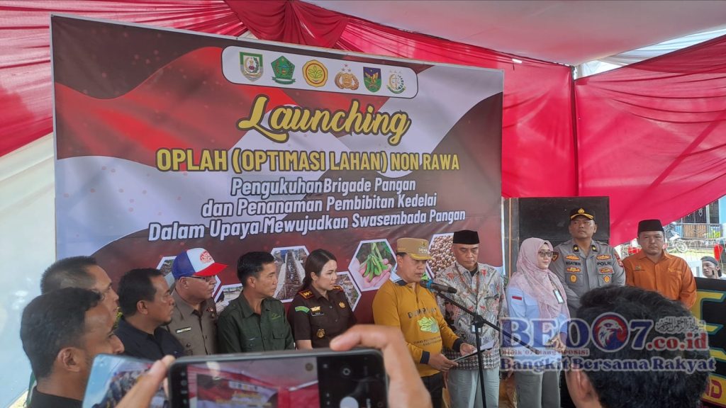 LEBONG, BEO07.CO.ID – Dalam rangka upaya mendorong serta mendongkrak pertumbuhan Swasembada pangan, Pemerintah Kabupaten Lebong kembali menunjukan konsistensinya dibidangnya pertanian. Bupati Lebong H. Azhari, SH., MH., bersama Forum Koordinasi Pimpinan Daerah (Forkopimda) dan perwakilan Pemerintah Provinsi Bengkulu secara resmi meluncur program Optimasi Lahan (OPLAH) Non Rawa yang dilaksanakan di Balai Benih Induk (BBI) Suka Bumi, Kecamatan Lebong Sakti, Senin (24/9).